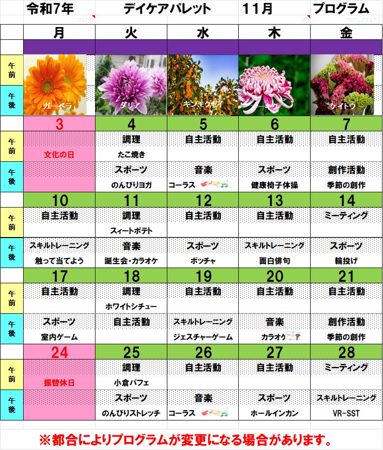 デイケアパレット11月プログラム