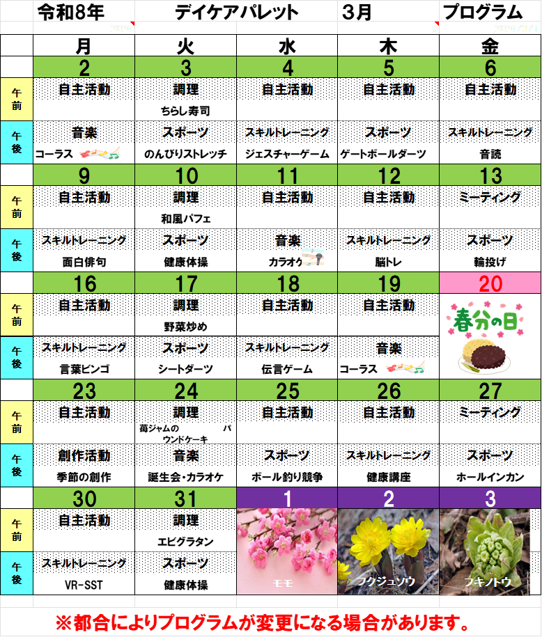 デイケアパレット3月プログラムになります。