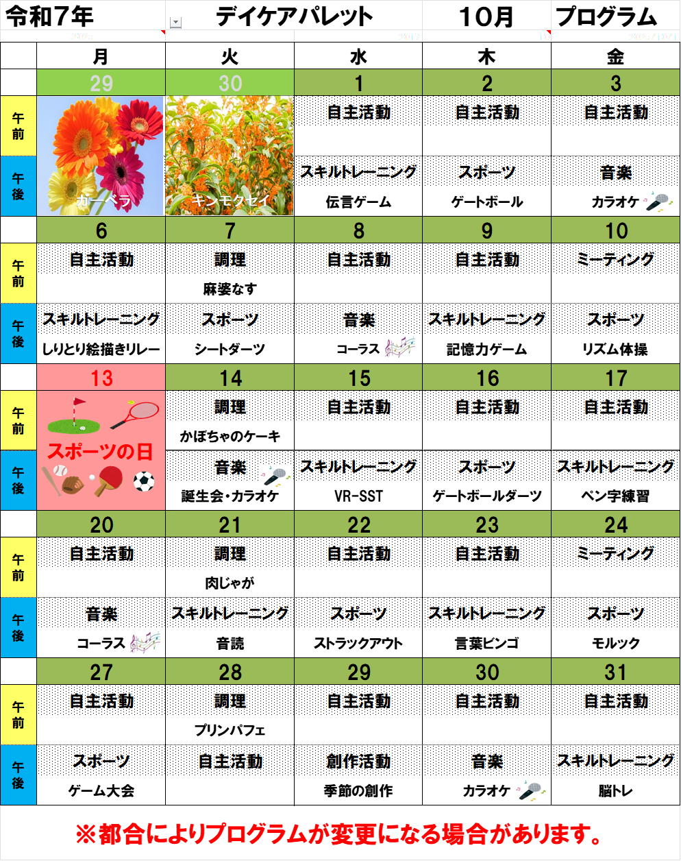 掲載が遅くなりました。デイケアパレット10月プログラムになります。