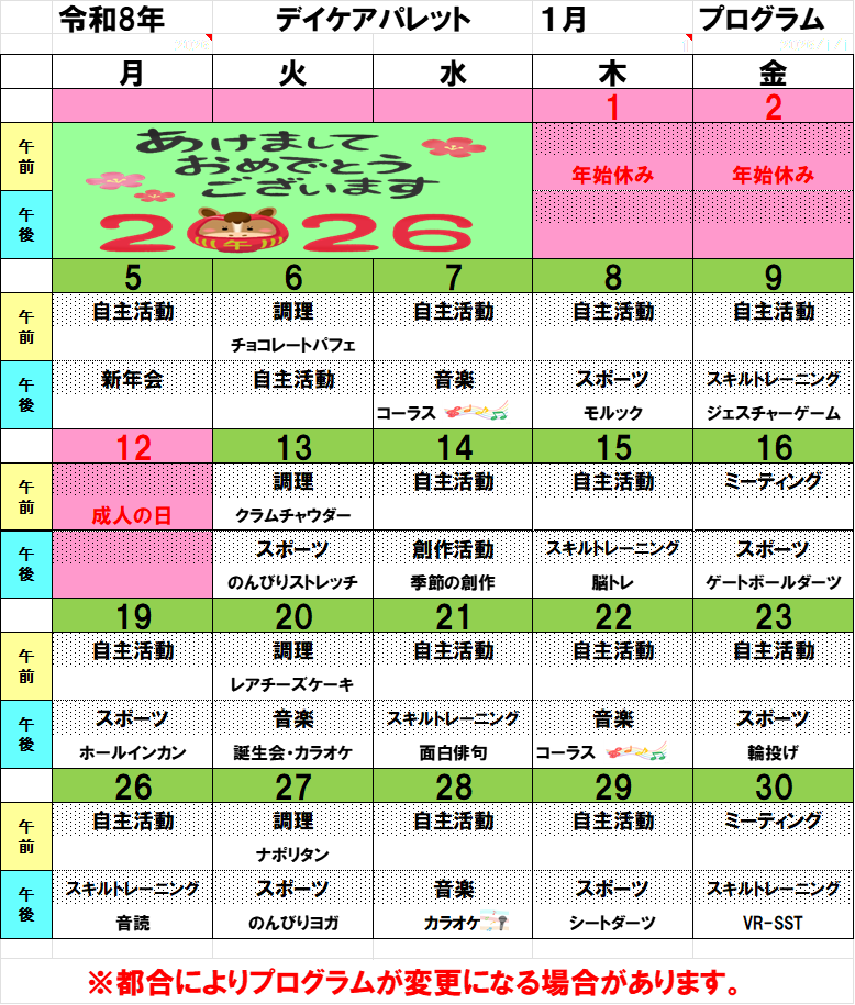 デイケアパレット1月プログラム