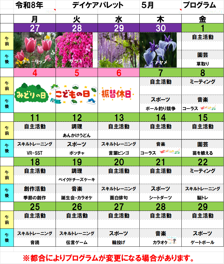 デイケアパレット5月プログラムになります。